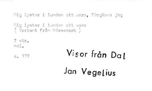 //// Mig lyster i lunden att vara, förgäves ia9 //// Mig lyster i lunden att vara ( Variant från Nössemark ) //// 2 str. mel. //// s. 179 Visor från Dal //// Jan Vegebus ////