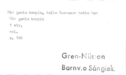 //// Min gamle kompis, Kalle Svensson hette han Min gamle kompis //// 1 str. //// mel. //// s. 108 //// Gren-Ni s:on //// Barnv.o Sån gi ////