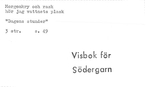 //// Morgonkry och rask //// hör jag vattnets plask //// "Dagens stunder" //// 3 str. s. 49 //// Visbok för //// Södergarn ////