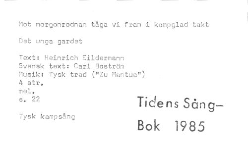 //// Mot morgonrodnan tåga vi fran i kampglad takt Det unga gardet //// Text: Heinrich Eildermann Svensk text: Carl Boströn Musik: Tysk trad ("Zu Mantua") 4 str. //// mel. //// s. 22 Tidens Sång- //// Tysk kampsång Bok 1985 ////