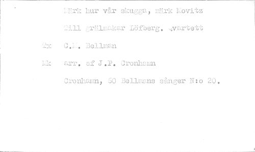 //// 1:rk hur vår skugga, 12.5.rk kbvitz 2:111 grälnkar Wfberg. //// 2x //// läk arr. af J.P. Cronhaun //// Cronhamn, 50 Bellrwis sånger N:o 20. ////