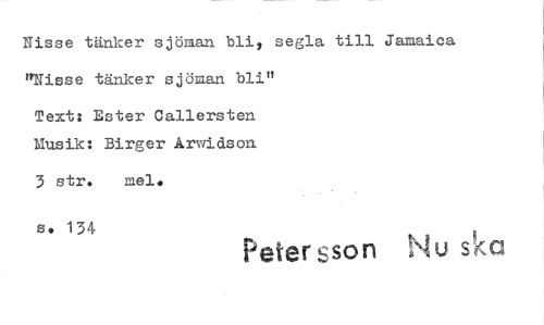 //// Nisse tänker sjöman bli, segla till Jamaica "Nisse tänker sjöman bli" //// Text: Ester Callersten //// Musik: Birger Arwidson //// 3 str. =el. //// e. 134 Petersson '\ u ska ////