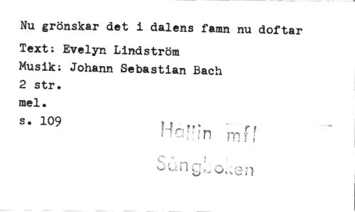 //// Nu grönskar det i dalens famn nu doftar //// Text: Evelyn Lindström //// Musik: Johann Sebastian Bach 2 str. //// mel. //// s. 1091-16!!r1 mfT ////