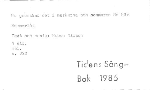 //// Nu grönskar det i markerna och sommaren är här Sommarlåt //// Text och musik: Ruben Nilson //// 4 str. mel. //// s. 320 //// Tidens Sbng- //// Bok 1985 ////