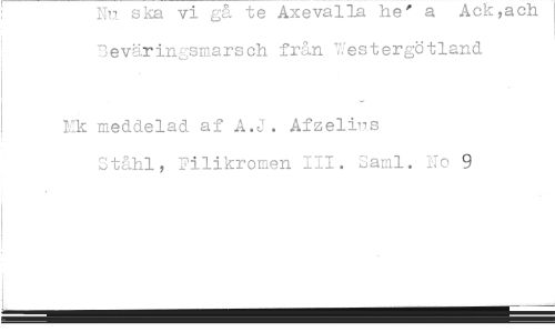 //// Nn ska vi gå te Axevalla he' a Ack,ach 73eväringsmarsch från 7:estergötland //// Mk meddelad af A.j. Afzelins //// Ståhl, 2ilikromen III. Aml. jo 9 ////