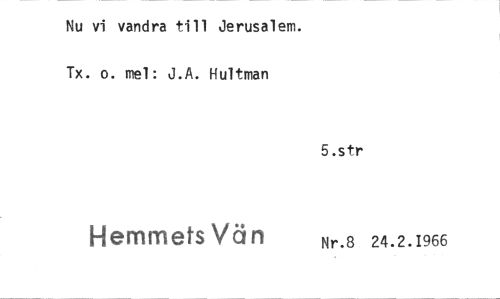 //// Nu vi vandra till Jerusalem. Tx. o. mel: J.A. Hultman //// 5.str //// Hemmets Vän Nr.8 24.2.1966 ////