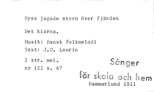 //// Nyss jagade storm över fjärden Det klarna. //// Musik: Dansk folkmelodi Text: J.O. Laurin //// 2 str. mel. nr 122 s. 67 Sånger //// för skeira och [Dem //// Hammarlund 1921 ////