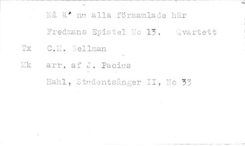 //// 7 - //// Nå ä' ni. alla församlade här Fredmans Epistel No 13. Qvartett //// Tx C.E. 3ellman //// Nk arr. af J. Paoius //// Hahl, Studentsånger II, No 33 ////