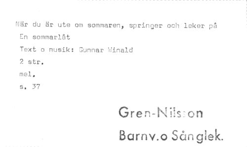 //// När du är ute om sommaren, springer och leker på En sommarlåt //// Text o musik: Gunnar Winald //// 2 str. //// mel. //// s. 37 //// Gren-NN-on //// Barnv.o Sånglek. ////