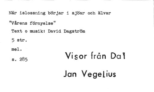 //// När islossning börjar i sjöar och älvar //// "Vårens förnyelse" //// Text o musik: David Dagström //// 5 str. mel. //// s. 285 Visor från Dal //// Jan Vegelius ////