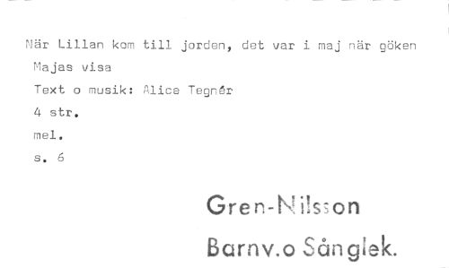 //// När Lillan kom till jorden, det var i maj när göken Majas visa //// Text o musik: Alice Tegnér //// 4 str. //// mel. //// s. 6 //// Gren-Nikton //// Bcirnv.o Sång ek. ////