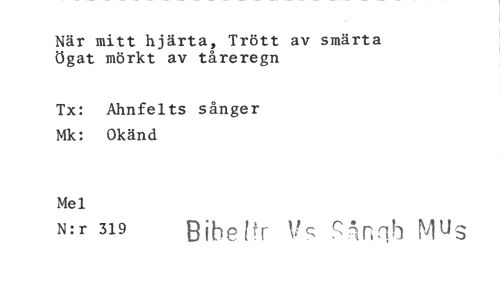 //// När mitt hjärta, Trött av smärta ögat mörkt av tåreregn //// Tx: Ahnfelts sånger Mk: Okänd //// Mel //// N:r 319 13ibeitr ‘/s s,"ingh mus ////