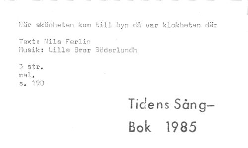 //// När skönheten kom till byn då var klokheten där //// Text: Nils Ferlin //// Musik: Lille Bror Söderlundh //// 3 str. mel. //// 6. 190 //// Tidens Sång— //// Bok 1985 ////