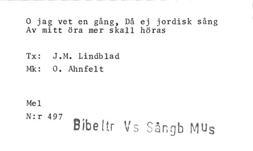 //// 0 jag vet en gång, Då ej jordisk sång Av mitt öra mer skall höras //// Tx: J.M. Lindblad Mk: 0. Ahnfelt //// Mel //// N:r 497 Bibeltr Vs Sångb Mus ////