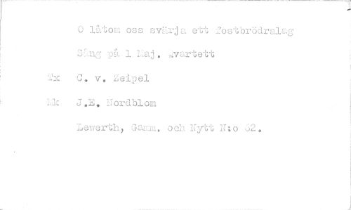 //// 0 ltom oss svärja ett fostbrödralag //// c. 1 laj. yartet,t //// 2x C. v, Zeipel //// J.E. Nordblom //// Lewerth, an=. och Nytt Nto 62. ////