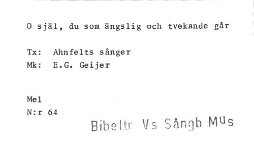 //// 0 själ, du som ängslig och tvekande går //// Tx: Ahnfelts sånger Mk: E.G. Geijer //// Mel //// N:r 64 //// 6ibefts Vs Sångb Mus ////