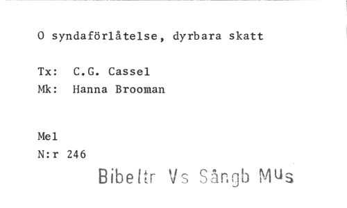 //// 0 syndaförlåtelse, dyrbara skatt //// Tx: C.G. Cassel Mk: Hanna Broovan //// Mel //// N:r 246 //// Bibeltr Vs Sångb Mils ////