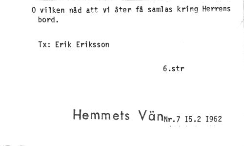 //// 0 vilken nåd att vi åter få samlas kring Herrens bord. //// Tx: Erik Eriksson //// 6.str //// Hemmets VänNr.7 15.2 1962 ////