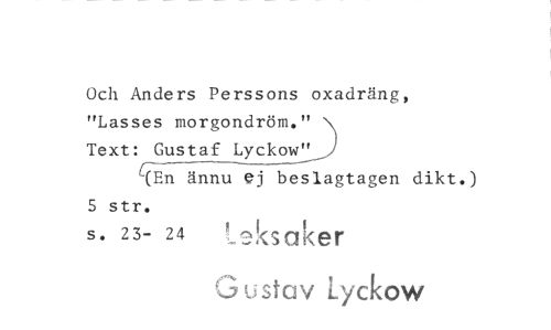 //// Och Anders Perssons oxadräng, "Lasses morgondröm." Text: Gustaf Lyckow" //// (gi17irinu ej beslagtagen dikt.) 5 str. //// s. 23- 24 eksaker //// 3ustav Lyckow ////