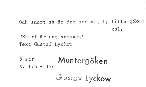//// Och snart så är det sommar, ty lille göken //// gal. //// "Snart är det sommar." //// Text Gustaf Lyckow //// 6 str //// s. 173 - 176 //// Muntergöken //// 'OS Lyckow ////