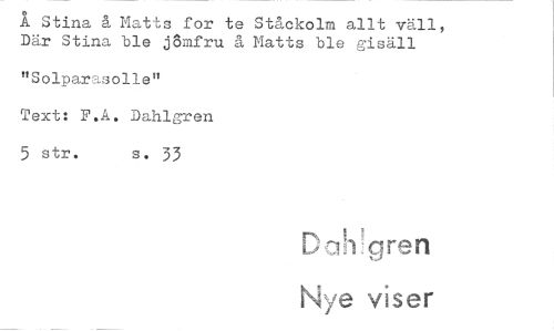//// Stina å Matts for te Ståckolm allt väll, Där Stina ble jömfru å Matts ble gisäll //// "Solparasolle" //// Text: F.A. Dahlgren //// 5 str. s. 33 //// --.111 gren //// Nye viser ////