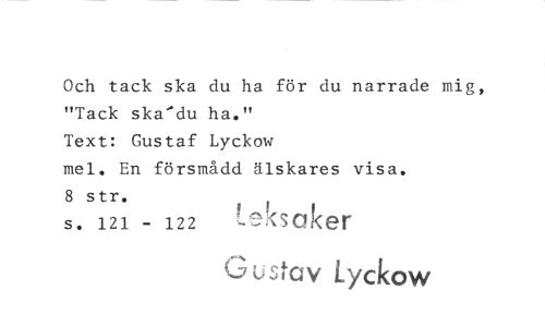 //// Och tack ska du ha för du narrade mig, //// "Tack ska'du ha." //// Text: Gustaf Lyckow //// mel. En försmådd älskares visa. //// 8 str. //// s. 121 - 122 1 4Saker //// Gustav Lyckow ////