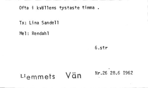 //// Ofta i kvällens tystaste timma . //// Tx: Lina Sandell Mel: Rendahl //// 6.str //// uemmets Vän Nr.26 28.6 1962 ////