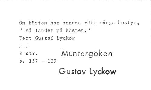 //// Om hösten har bonden rätt många bestyr, " På landet på hösten." Text Gustaf Lyckow //// 8 str. Muntergöken //// s. 137 - 139 //// G ustav Lyckour ////
