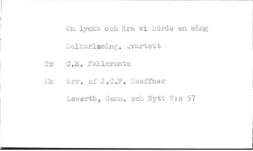 //// Om lycka och ära vi hörde en sång //// Dalkarlasång. ,ivartett //// Tx- C.B. Fahlcrantz //// Lic arr. af J.C.F. Haeffner //// Lewerth, Gamm. och Nytt N:o 57 ////