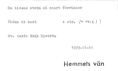 //// Om tidens ström så snart förrinner //// Tiden är kort 4 str. I ) //// Sv. text: Erik Nyström //// 1979-01-11 //// Hemmets vän ////