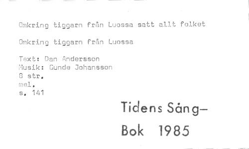 //// Omkring tiggarn från Luossa satt allt folket Omkring tiggarn från Luossa //// Text: Dan Andersson //// Musik: Gunde Johansson //// 0 str. mel. //// s. 141 //// Tidens Sång— //// Bok 1985 ////