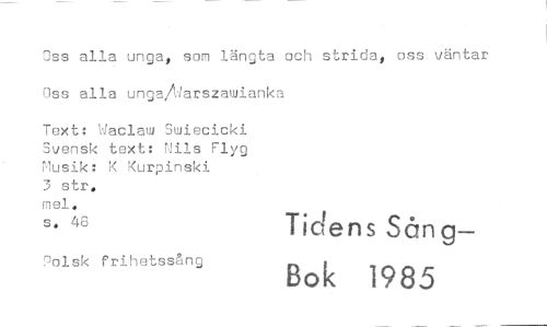 //// Oss alla unga, som längta och strida, oss väntar Oss alla unga/Warszawianka //// Text: Waclaw Swiecicki Svensk text: Nils Flyg Musik: K Kurpinski //// 3 str. //// mel. //// s. 48 Tidens Sång— //// Polsk frihetssång Bok 1985 ////