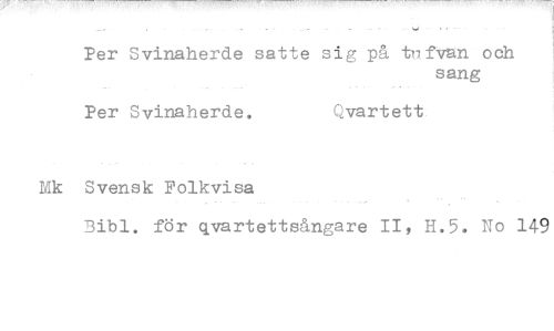 //// Per Svinaherde satte sig på tylfvan och //// sang //// Per Svinaherde. Qvartett. //// Mk Svensk Folkvisa //// Bibl. för qvartettsångare II, H.5. 1,10 149 ////