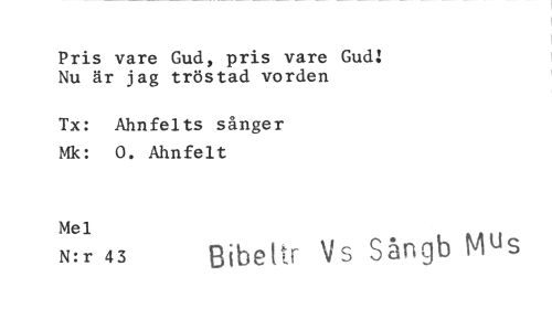 //// Pris vare Gud, pris vare Gud: Nu är jag tröstad vorden //// Tx: Ahnfelts sånger Mk: 0. Ahnfelt //// Mel //// N:r 43 Bibettr tis Sångb Mus ////