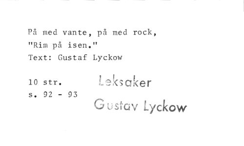 //// På med vante, på med rock, "Rim på isen." //// Text: Gustaf Lyckow //// 10 str. Leksaker //// s. 92 - 93 //// G 1,Skes; Lyckow ////