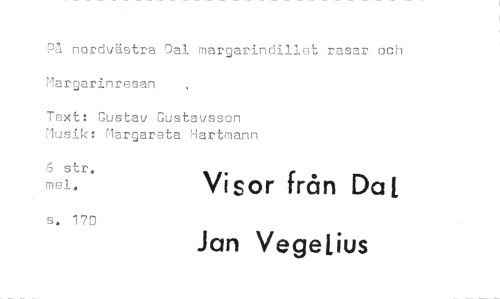 //// På nordvästra Dal margarindillet rasar och Margarinresan //// Text: Gustav Gustavsson Musik: Margareta Hartmann //// 6 str, mel. Visor från Dal //// s. 170 Jan Vegelius ////