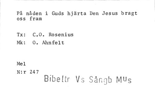 //// På nåden i Guds hjärta Den Jesus bragt oss fram //// Tx: C.O. Rosenius Mk: 0. Ahnfelt //// Mel //// N:r 247 //// Bibeltr tis Sångb Mus ////