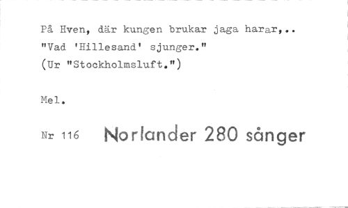 //// På Hven, där kungen brukar jaga harar,.. "Vad 'Hillesand' sjunger." (Ur "Stockholmsluft.") //// Me 1. //// Nr 116 Norlander 280 sånger ////