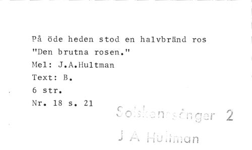 //// På öde heden stod en halvbränd ros //// "Den brutna rosen." //// Mel: J.A.Hultman //// Text: B. //// 6 str. //// Nr. 18 s. 21 //// ...J n ////
