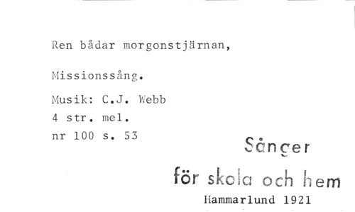//// Ren bådar morgonstjärnan, //// Missionssång. Sånc7er //// Musik: C.J. Webb 4 str. mel. nr 100 s. 53 iö siox: .och n- em //// Hammarlund 1921 ////