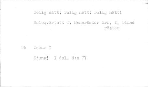 //// Rolig natt: rolig nattt rolig natt: //// Soloqvartett f. ransröster arr. f. bland //// röster //// Liz Oskar 1 //// Sjung: 1 del. N:o 77 ////