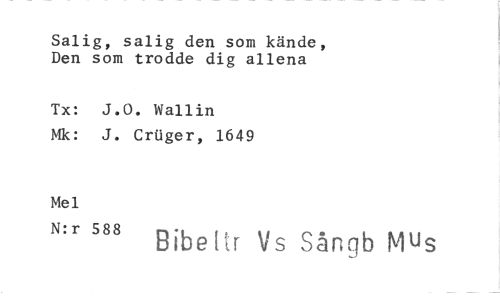 //// Salig, salig den som kände, Den som trodde dig allena //// Tx: J.O. Wallin //// Mk: J. CrUger, 1649 //// Mel //// N:r 588 Bibe ids Sångb Mus ////