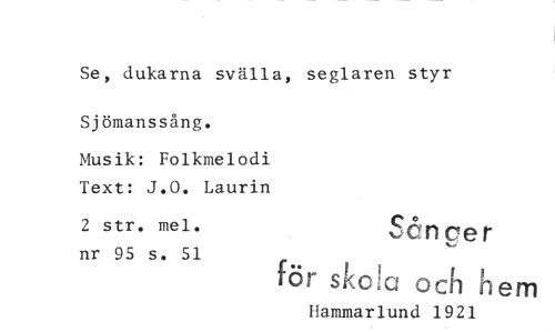 //// Se, dukarna svälla, seglaren styr Sjömanssång. //// Musik: Folkmelodi Text: J.O. Laurin //// 2 str. mel. Sånger //// nr 95 s. 51 för skoict och hem //// Hammarlund 1921 ////