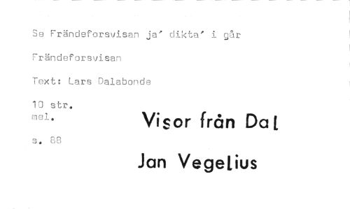 //// Se Frändeforsvisan ja' dikta' i går Frändeforsvisan //// Text: Lars Dalabonde //// 10 str. //// mel. Visor från Da //// s. 88 //// Jan Vegelius ////
