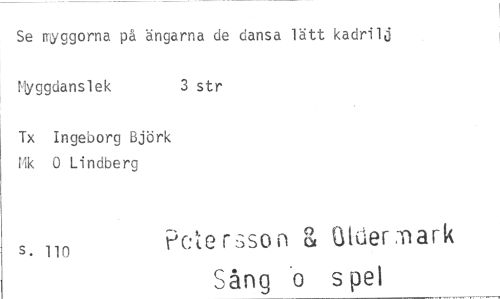 //// Se myggorna på ängarna de dansa lätt kadrilj //// Myggdanslek 3 str //// Tx Ingeborg Björk Mk 0 Lindberg //// s. 110 Petersson & Gleien-nark //// Sång .0 spel ////