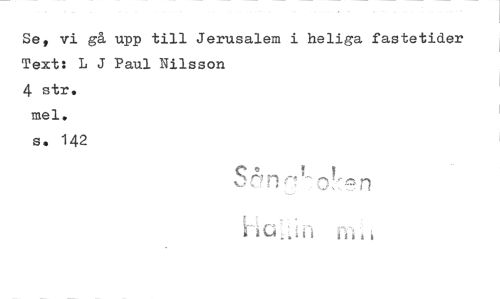 //// Se, vi gå upp till Jerusalem i heliga fastetider //// Text: L J Paul Nilsson //// 4 str. //// me 1, //// s. 142 //// • //// u 1 flu ////