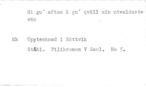 //// Si gu' afton å gu' qväll min utvaldaste vän //// Upptecknad i Rättvik //// Ståhl. Filikromen V Sami. No 5.