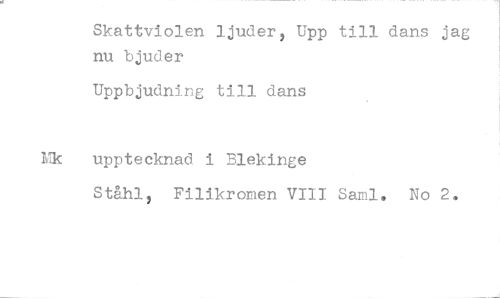 //// Skattviolen ljuder, Upp till dans jag nu bjuder //// Uppbjudning till dans //// Mk upptecknad i Blekinge //// St&hl, Filikromen VIII Sami. No 2.