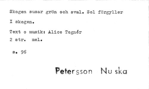 //// Skogen susar grön och sval. Sol förgyller //// 1 skogen. //// Text o musik: Alice Tegnér //// 2 str. mel. //// s. 96 //// Petersson Nu ska
