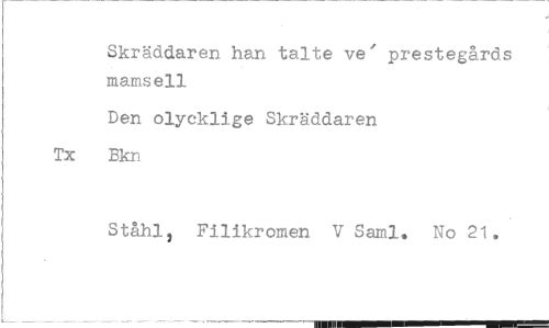 //// Skräddaren han talte ve^ prestegårds mamsell //// Den olycklige Skräddaren Bkn //// Ståhl, Filikromen VSaml. No 21.
